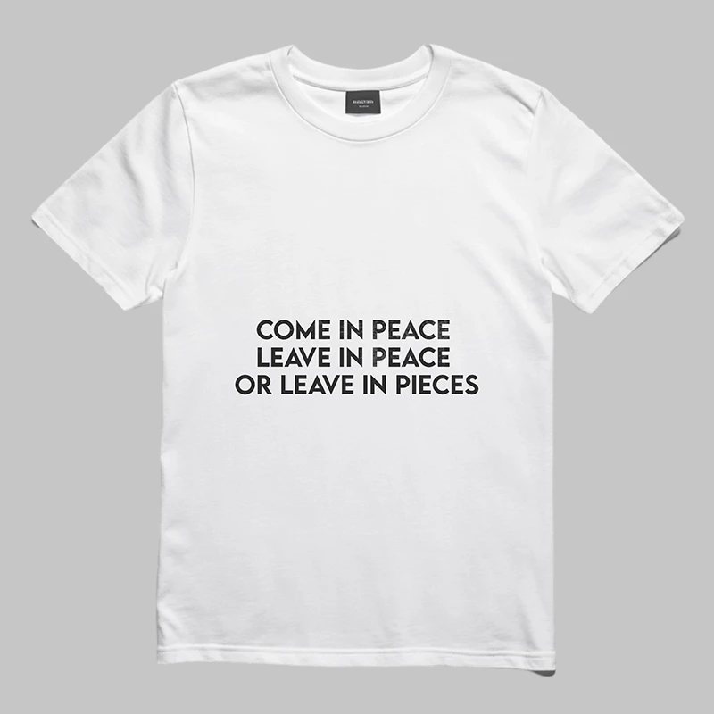 A clean white T-Shirt with a sharp message. “Come in peace, leave in peace, or leave in pieces”